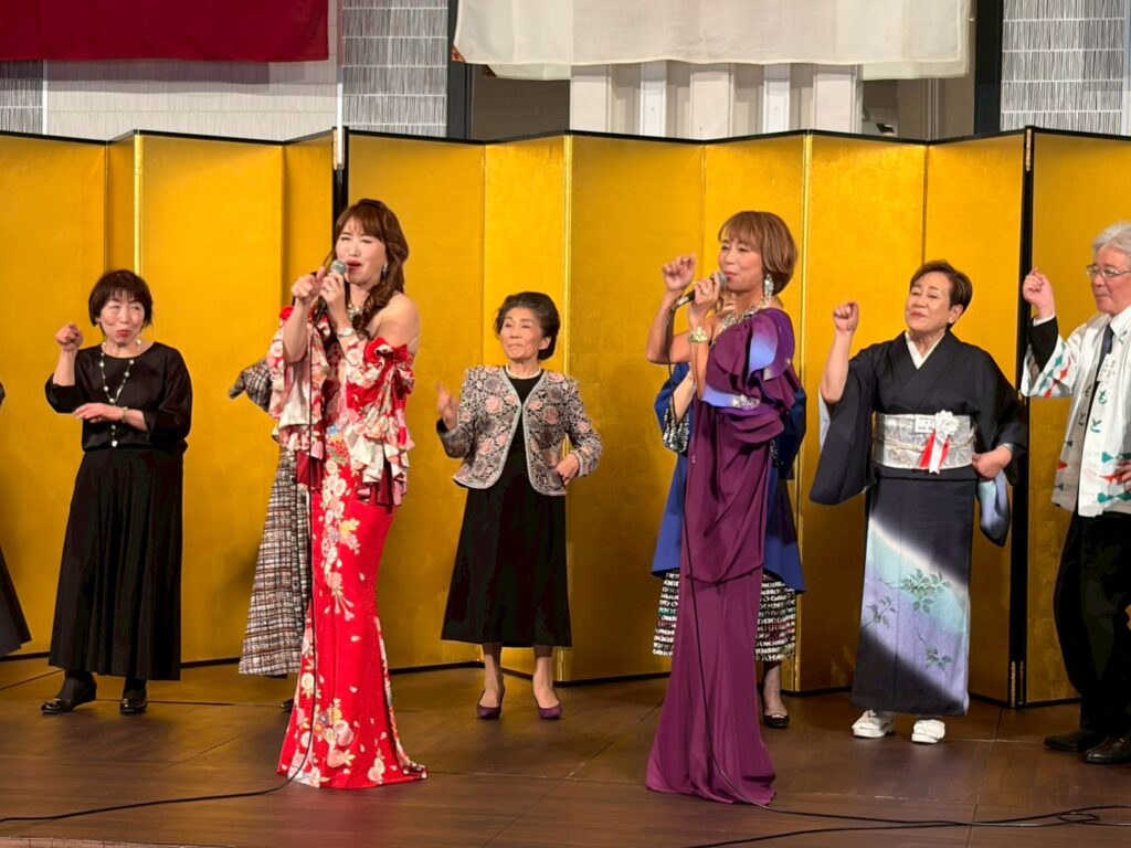 美味しい食事とお酒をいただきながら、テーブル内での談笑、他団体の方々との交流など、楽しいひとときを過ごしつつ、ステージでの「『美神-ヴィーナス』歌声の花束を!」を満喫し、最後に「火の国旅情」の合唱で会が終わりました。