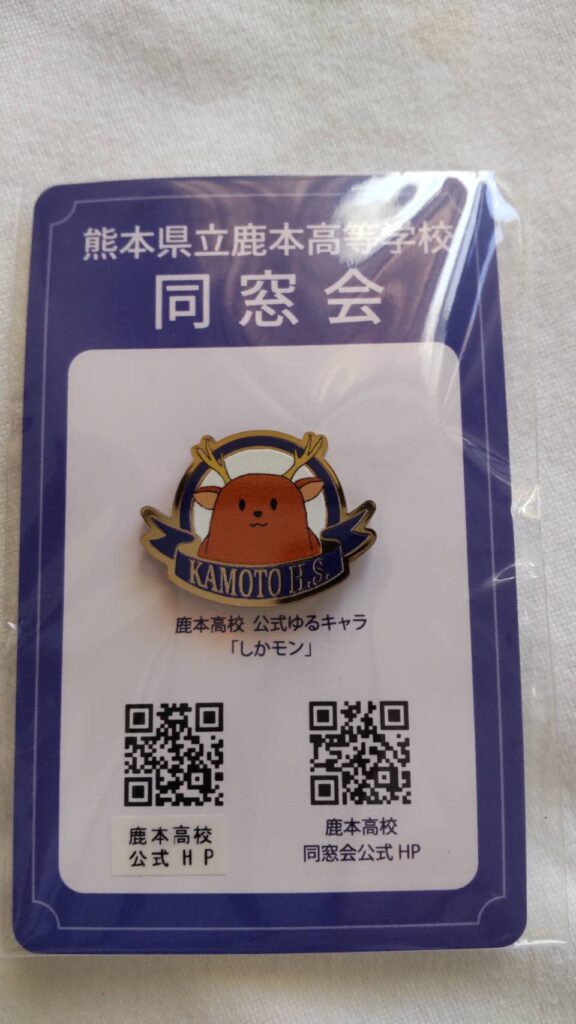 鹿本高校には、「しかモン」という応援キャラクターがいて、学校パンフレットのあちこちに登場します。在校生支援金事業で制作された「しかモンピンバッチ」を寄付をした方に贈呈しますよ、ということで、スタッフの方が懇親会のテーブルをまわっていました。